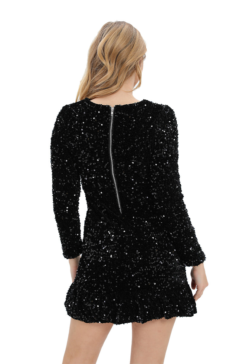 Sequin mid length dress featuring v neckline fitted sleeves and fitted hem and zipper back. Size Guide Size Length Shoulder Chest Waist S 31 14 33 29 L 32 15 34 30